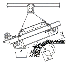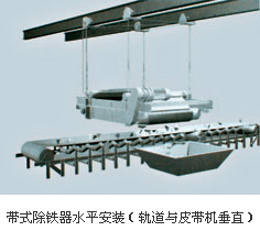 軌道方向:根據(jù)現(xiàn)場條件,除鐵器在大皮帶機頭上方吊掛,其軌道可與大皮帶方向垂直或同向?;虺F器在大皮帶上下山段或水平段止方吊掛,其軌道方向必須與大皮帶方向垂直。